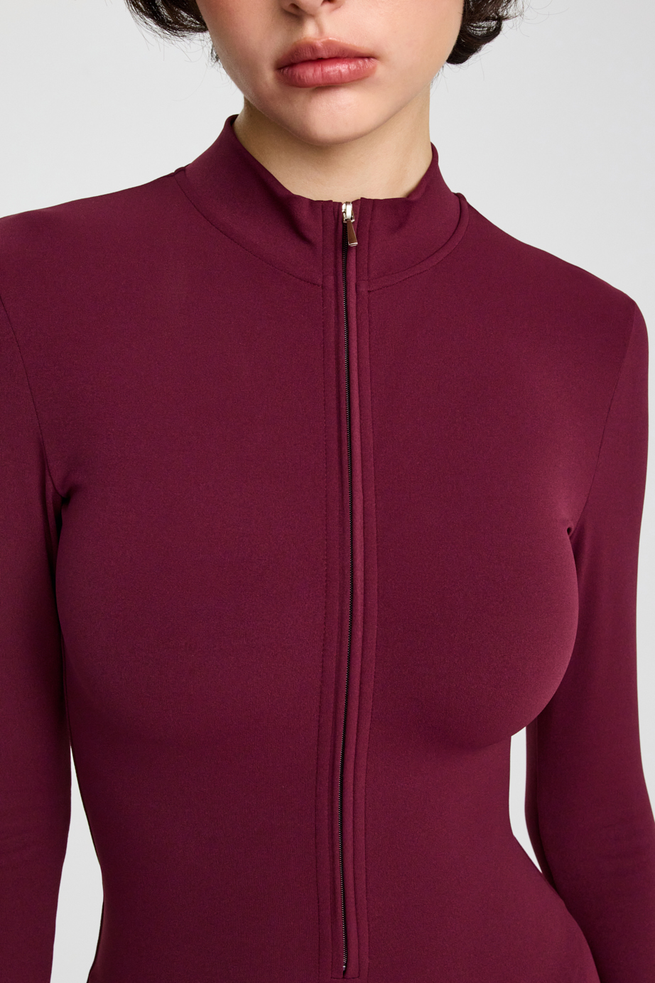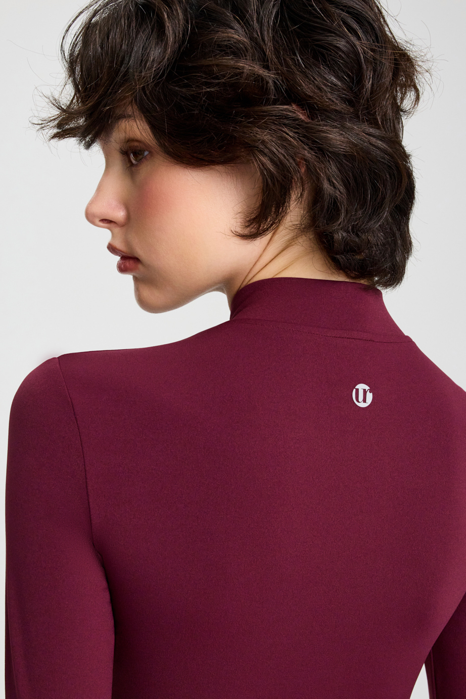 Удобство и стиль: Полузастежка-молния на груди с воротником-стойкой не только выглядит современно и стильно, но и обеспечивает легкое надевание и снятие, а также позволяет регулировать терморегуляцию во время тренировки. Дизайн способствует естественной поддержке и легкому пуш-ап эффекту.
