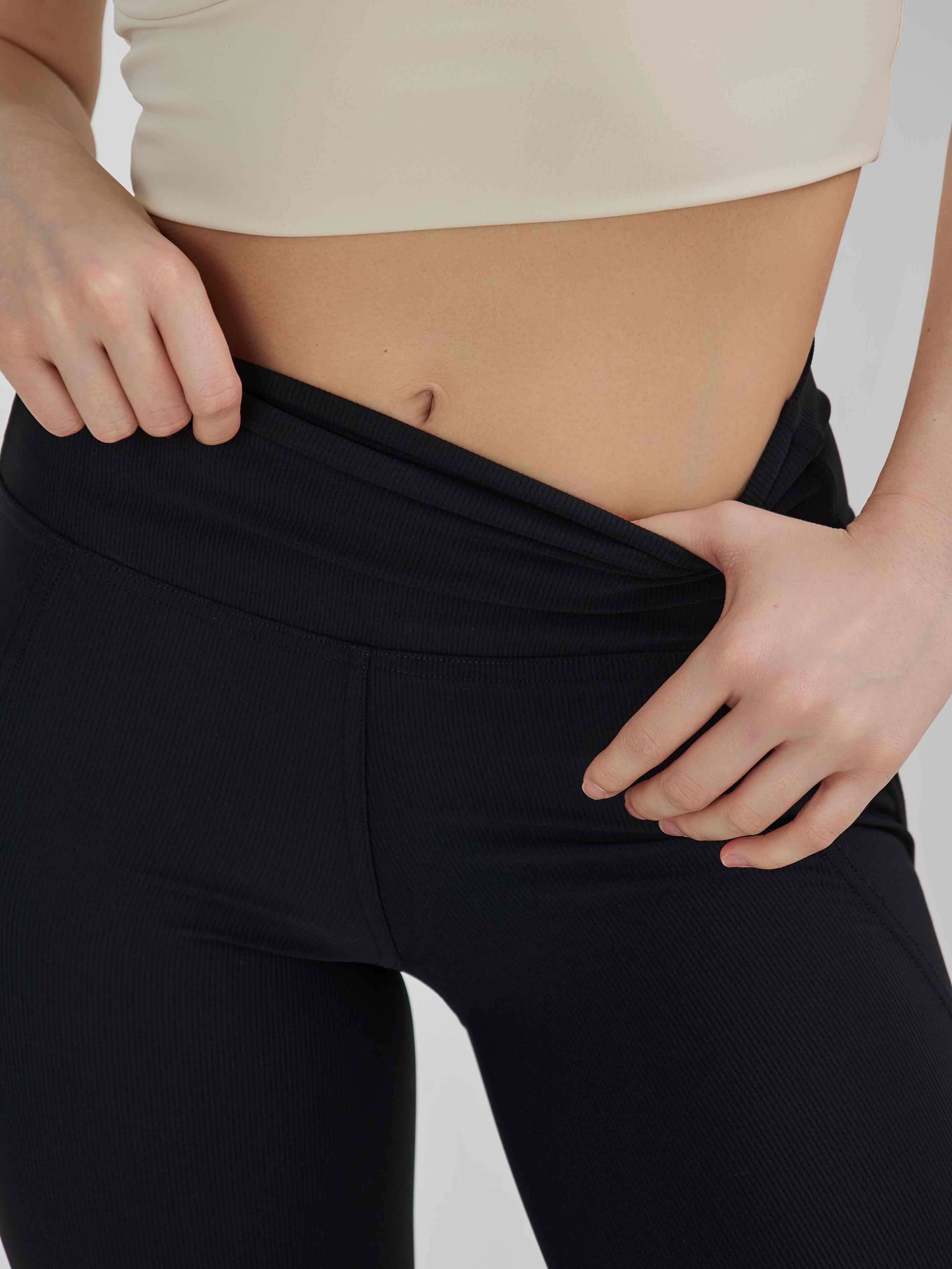 Модель выполнена из плотной эластичной ткани в рубчик, которая мягко облегает фигуру, подчеркивает силуэт и обеспечивает максимальную свободу движений. Высокая посадка формирует аккуратную линию талии и обеспечивает надежную фиксацию без сползания.